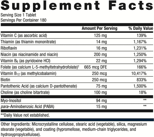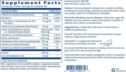 Klaire Labs Thera-B - Essential Vitamin B Complex, Hypoallergenic Formula with Activated Metafolin Folate (L-5-MTHF), Biotin & Methylcobalamin, 100 Tablets