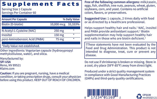 Klaire Labs Hair and Nails Formula - 10000 Micrograms Soy & Dairy-Free Biotin Complex with Inositol & PABA, 60 Capsules