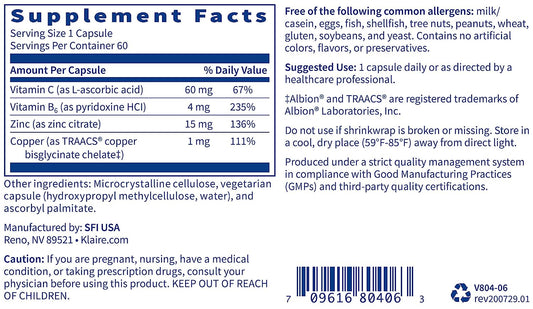 Klaire Labs Zinc Plus Immune Support Supplement - Zinc Citrate with Copper, Vitamin B6 & Vitamin C, 60 Capsules