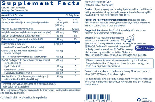Klaire Labs Joint Support Formula - Promotes Joint Recovery & Cartilage Production with Hydrolyzed Collagen, Chondroitin & Hyaluronic Acid, 120 Capsules