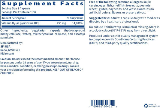 Klaire Labs Vitamin B6-250 Milligrams Hypoallergenic High Potency Pyridoxine HCl for Immune & Nervous System Support, Assists B12 Absorption, 150 Vegetarian Capsules