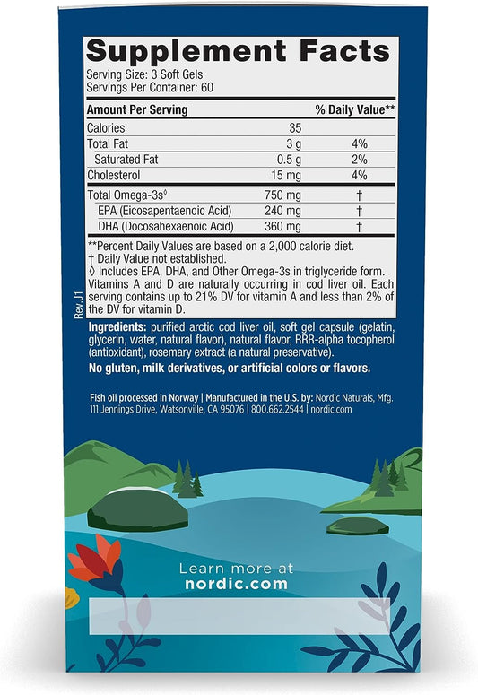 Nordic Naturals Arctic Cod Liver Oil, Lemon - 180 Soft Gels - 750 mg Total Omega-3s with EPA & DHA - Heart & Brain Health, Healthy Immunity, Overall Wellness, 180 Softgels